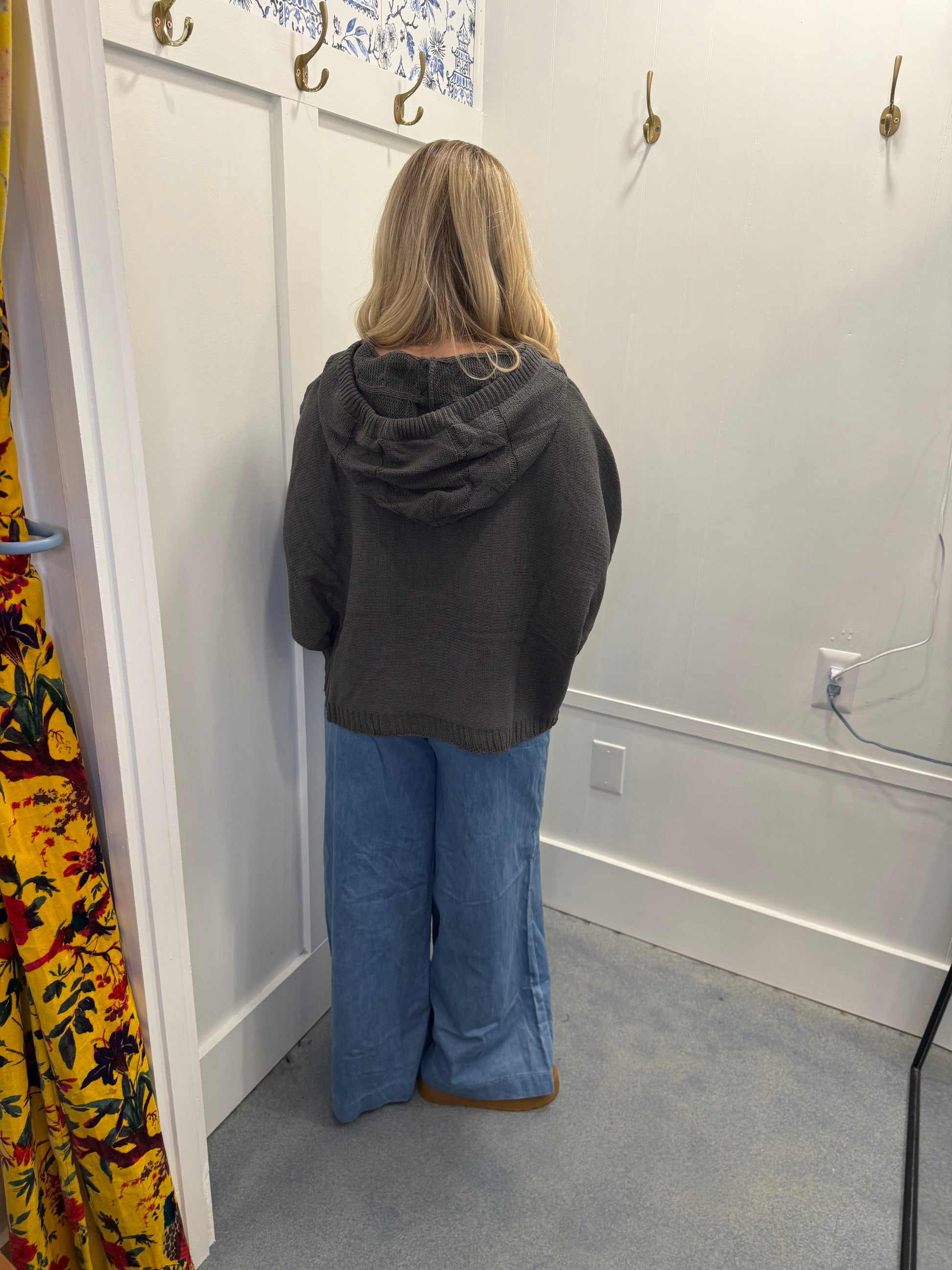 Designed in balloon sleeve roomy fit sweater hoodie top in chenille with print loop point, twisted weave, solid color.