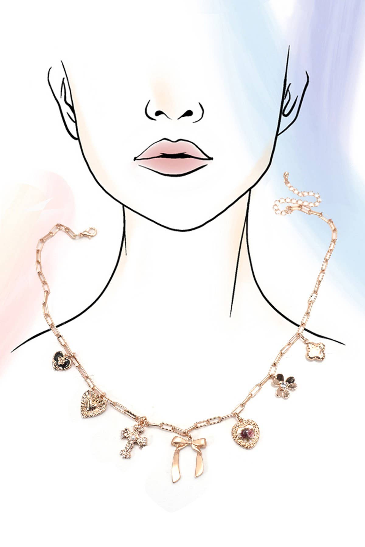 Charm necklace features a romantic blend of porcelain floral heart, soft matte bow, cross, and classic heart charms. Each element is thoughtfully placed on a delicate chain, offering a mix of vintage-inspired elegance and modern charm.