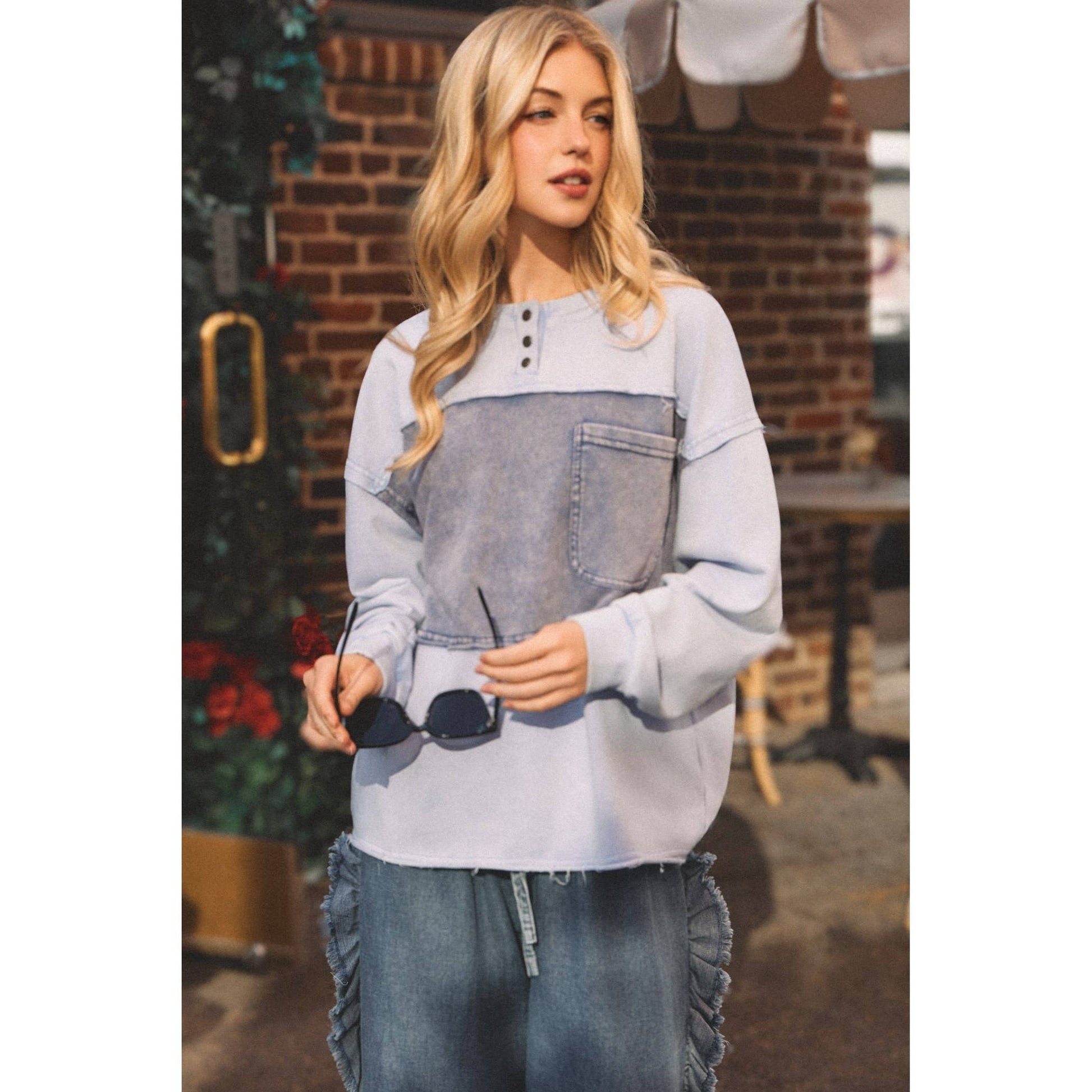 Cool, casual, and effortlessly stylish - this denim contrast pullover is made for laid-back days with a modern twist. Featuring a soft light blue body and a bold washed denim panel across the chest, it blends texture and tone in the best way.