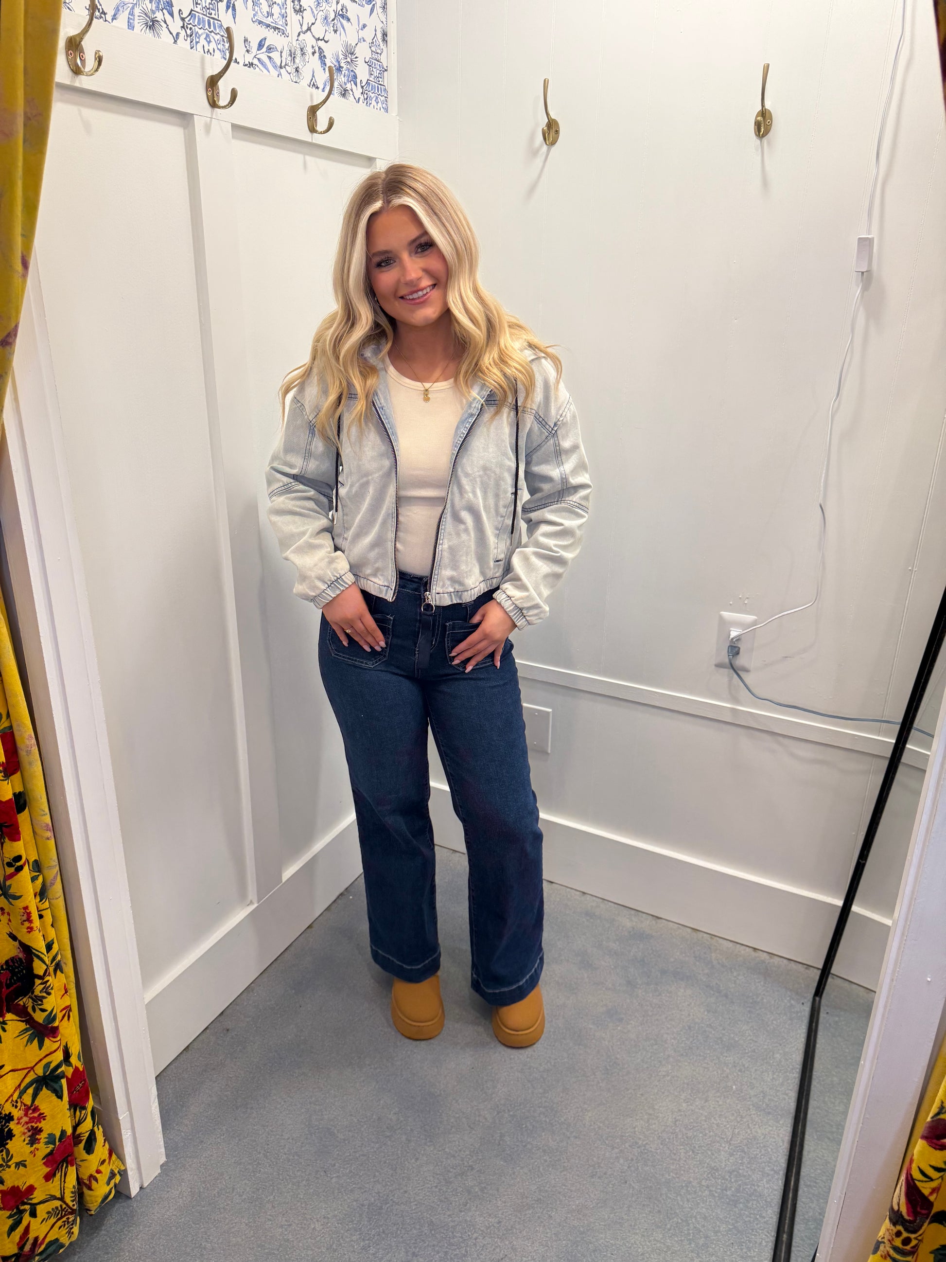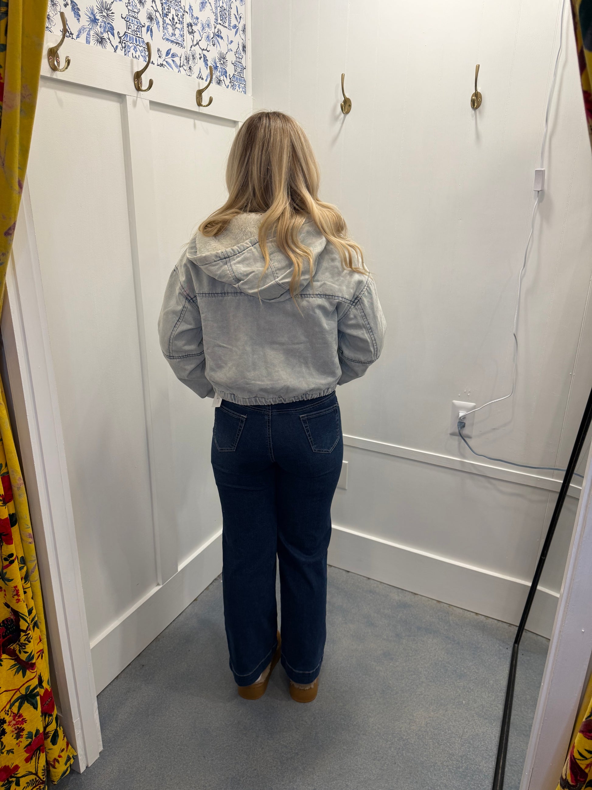 Hooded jacket with zipper closure and pockets. Sherpa inner lining.