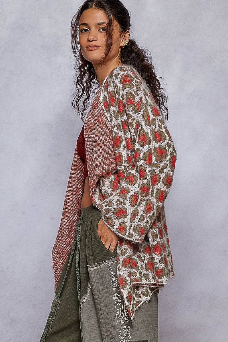Designed open cardigan, straight sleeve, relaxed fit top in mohair sweater pointed leopard pattern.