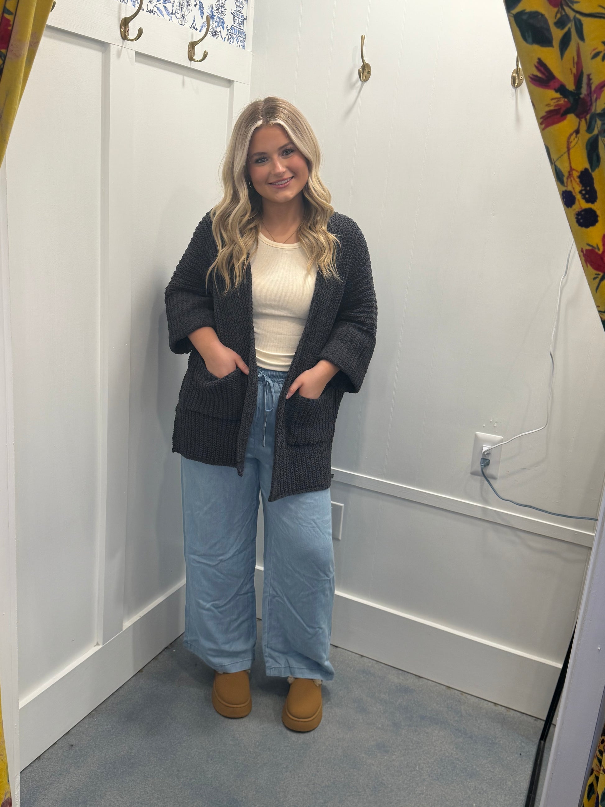 Wrap yourself in comfort with this edge-to-edge long sleeve cardigan, designed in a roomy fit for easy layering and a relaxed look. Complete with convenient pockets, this versatile piece adds both function and style to any outfit. The open-front design offers effortless wear, making it the perfect throw-on layer for transitional weather or cozy indoor moments.