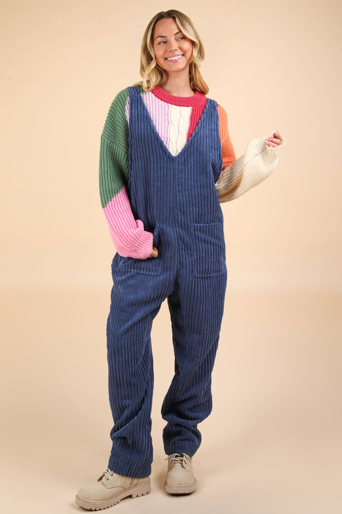- Cozy Soft Corduroy Jumpsuits - Sleeveless - Deep V-Neck - Adjustable Strap - Front Pockets