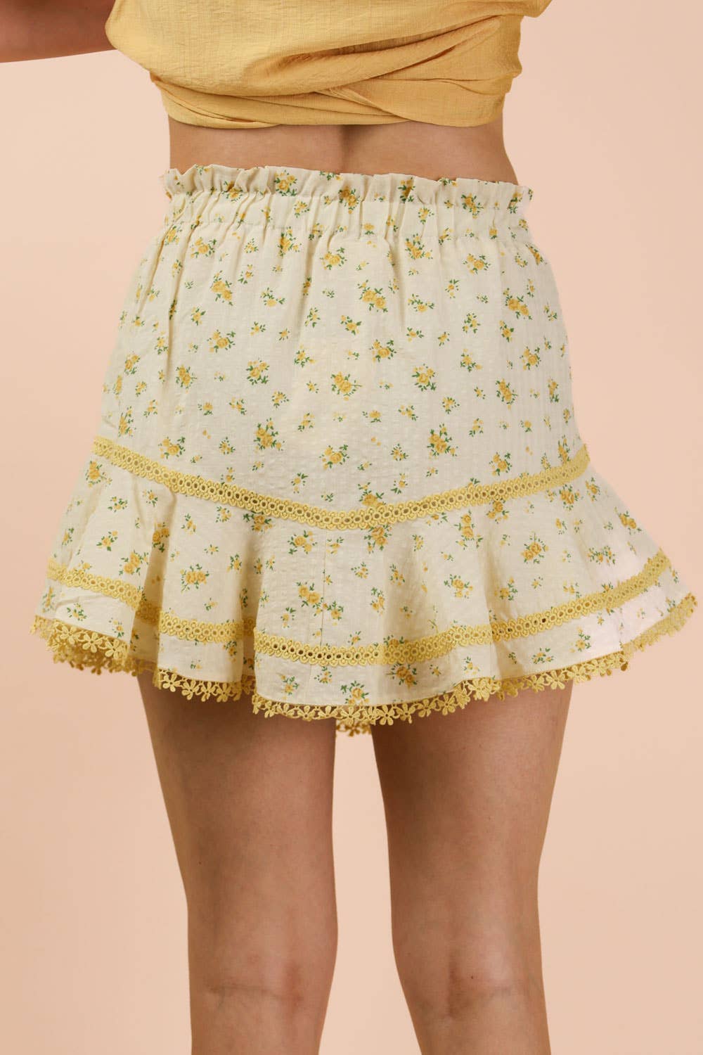 Floral Printed Ruffled Shorts W/ Crochet Trim - W/ Lining - Elastic Waist