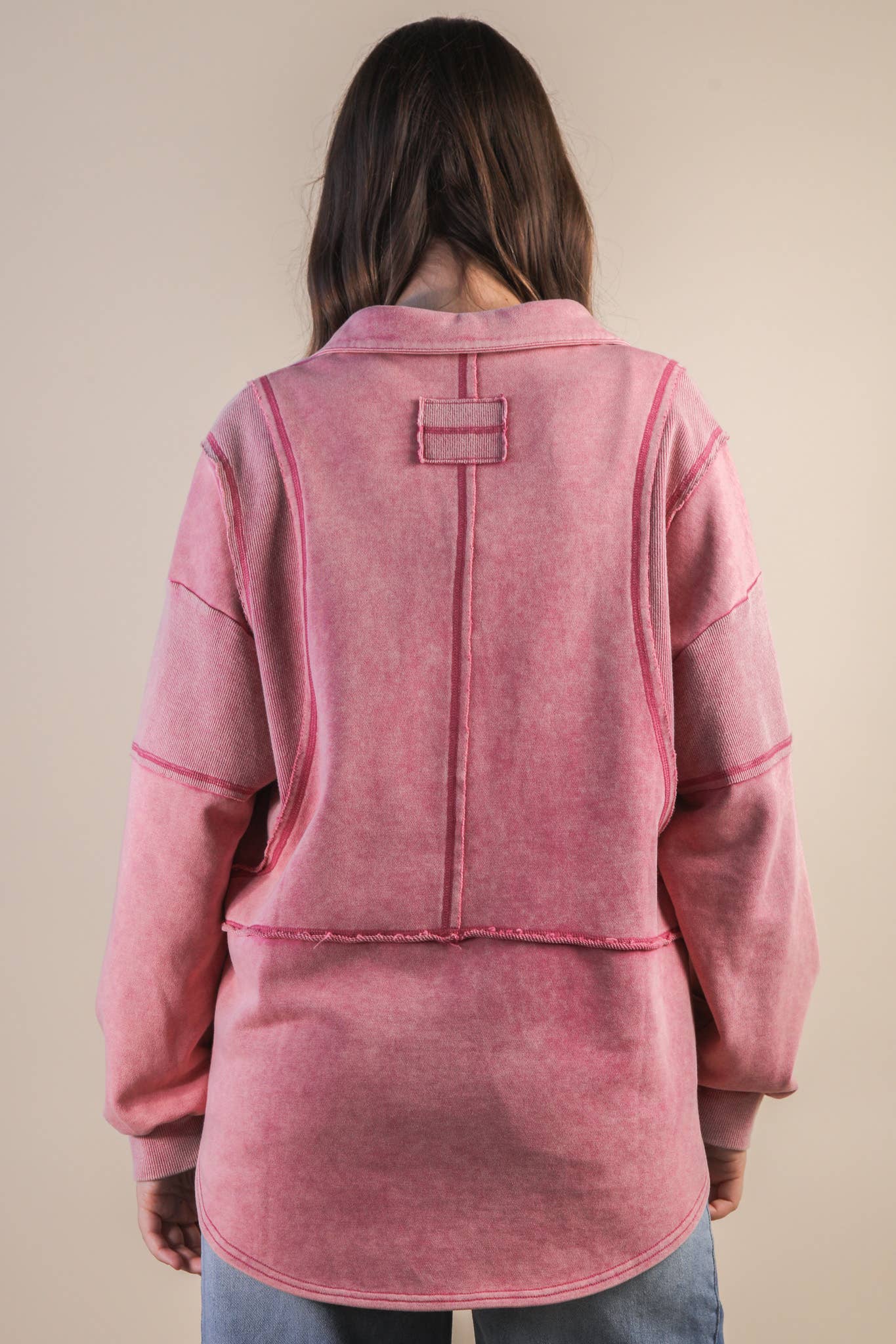 Mineral Washed Oversized French Terry Knit Top - Collared - Drop Shoulder - Long Sleeve - Round Hem 62%POLYESTER 34%COTTON 4%SPANDEX