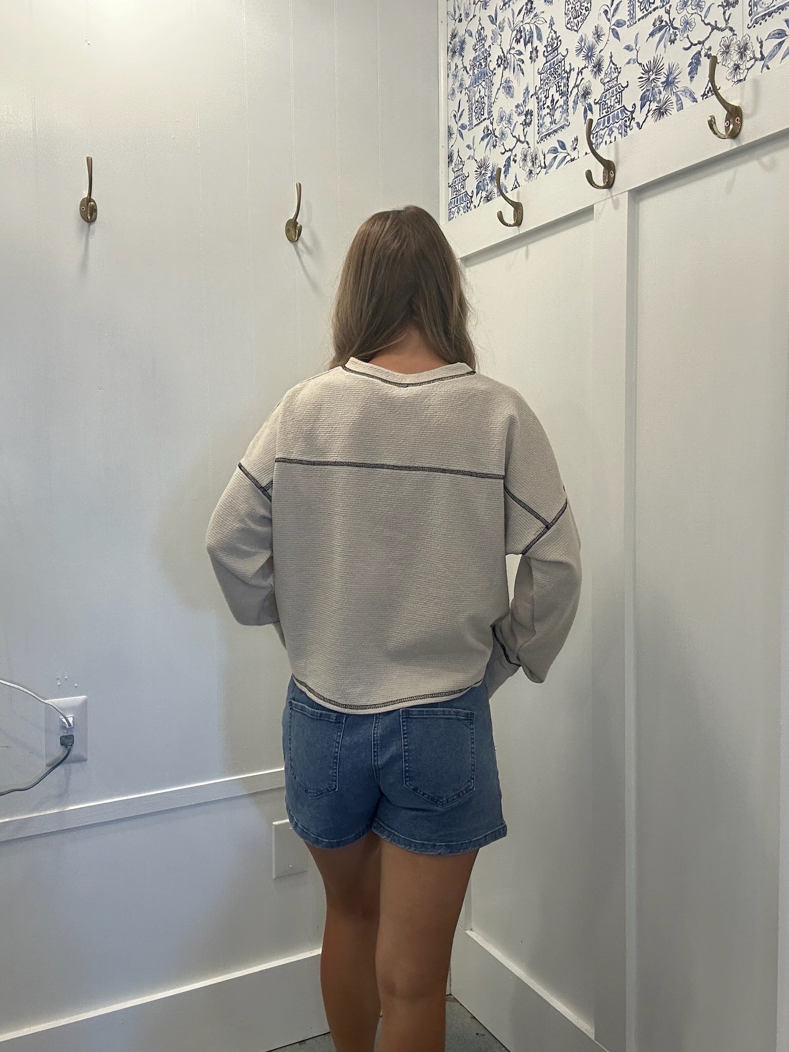 Solid, long sleeve, crew neck waffle knit pullover. It features a relaxed oversized fit with dropped shoulders, a slightly cropped hemline, and ribbed detailing at the neckline, cuffs, and hem. The casual yet stylish design makes it versatile for both lounging and everyday wear, easily paired with jeans, leggings, or joggers.