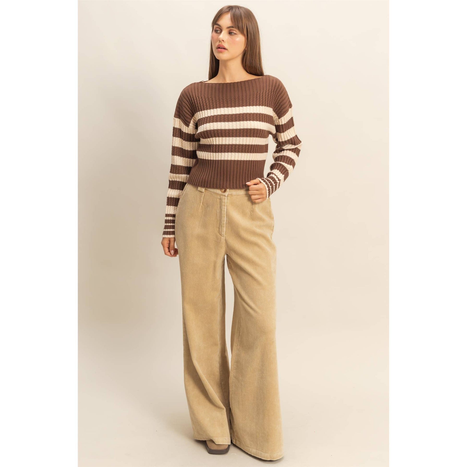 Discover the epitome of refined comfort with these contemporary wide-leg trousers. A meticulously tailored high-waist silhouette, coupled with a luxurious corduroy texture, lends classic elegance and unparalleled comfort. These trousers feature belt loops, a single button closure, and soft pleating that gracefully drapes, offering both style and versatility. 80% Cotton 20% Viscose