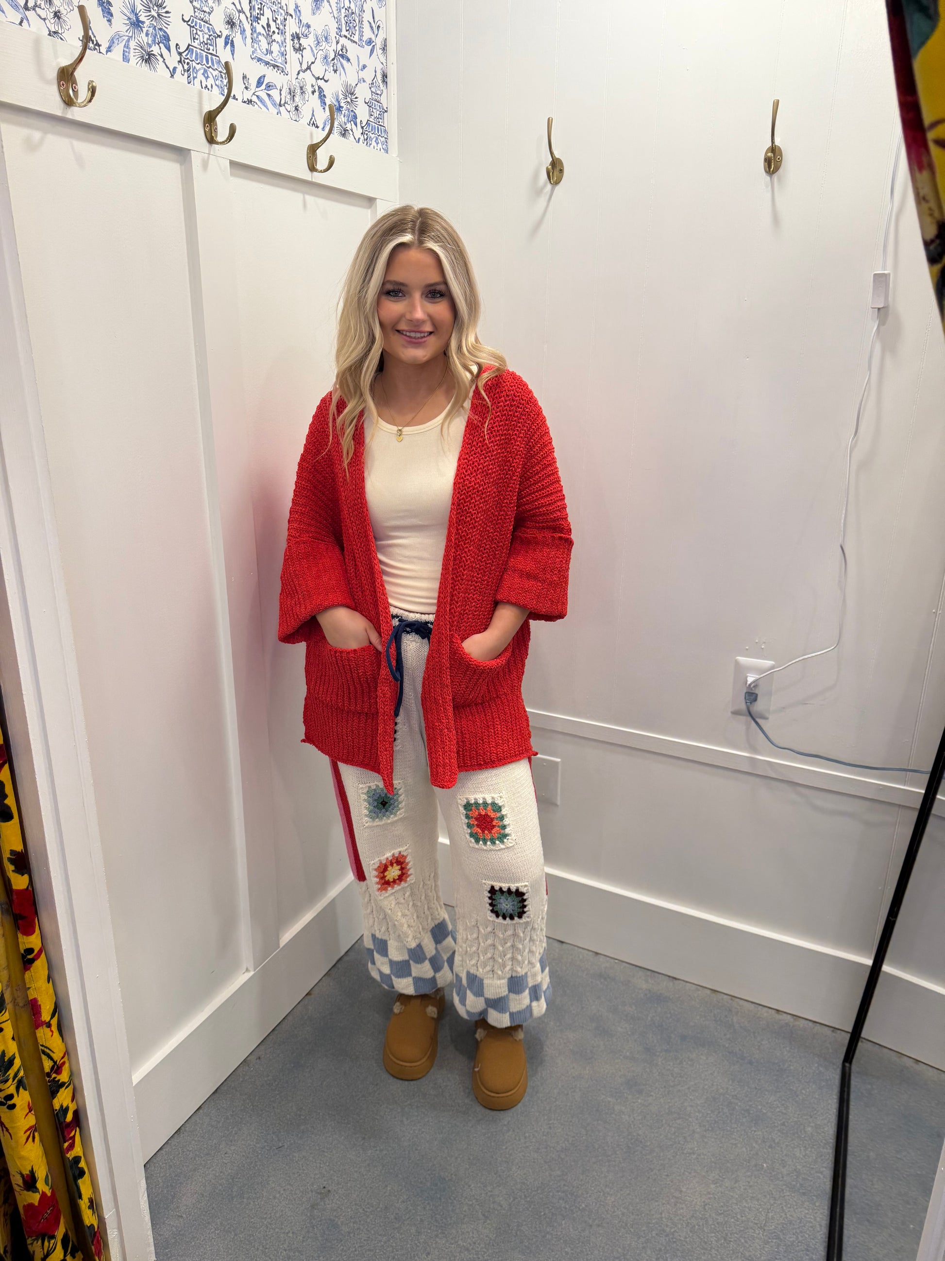 Designed in pants, relaxed fit in chenille sweater with patch detail pointed striped and checker pattern.